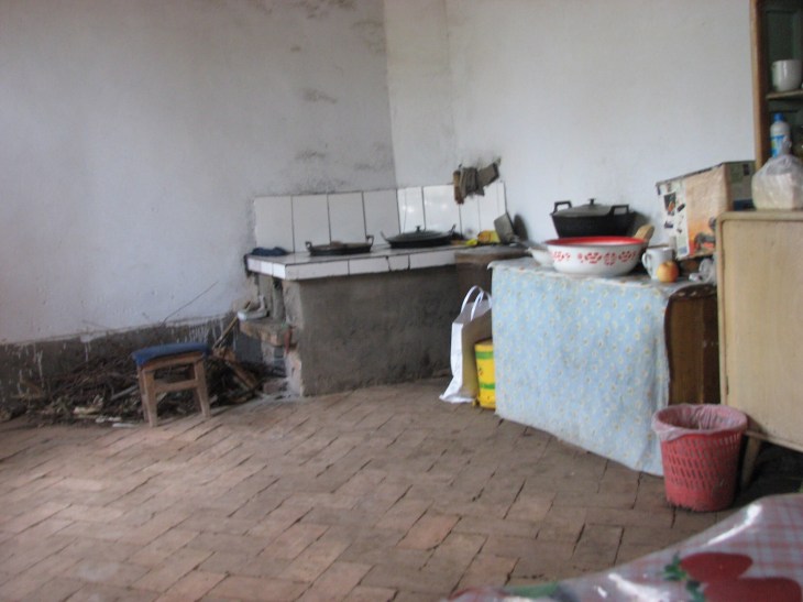 In the one room was everything; a kang bed (platform bed for sleeping and socializing on), a few kitchen cupboards in a corner with woks set in the top and a place to build a wood fire underneath. There was no fridge or any modernity at all and there was a plastic tablecloth on a little table in the middle of it all. The bedding was folded so neatly- as is the custom in China in daytime so you can sit on the kang. A floor of bricks swept immaculately. Most likely there were more to the family than just these two women. In the countryside in China many members of a family may sleep on a kang bed. A fire is kept constantly alight under it in winter and its absolutely wonderful to sit on and chat. (The fire is accessed and fed from a hole in the wall outside the house. We have had many visits with hospitable Chinese on a warm kang with a blanket over our legs, with tea and bread on a low kang table in the middle.)