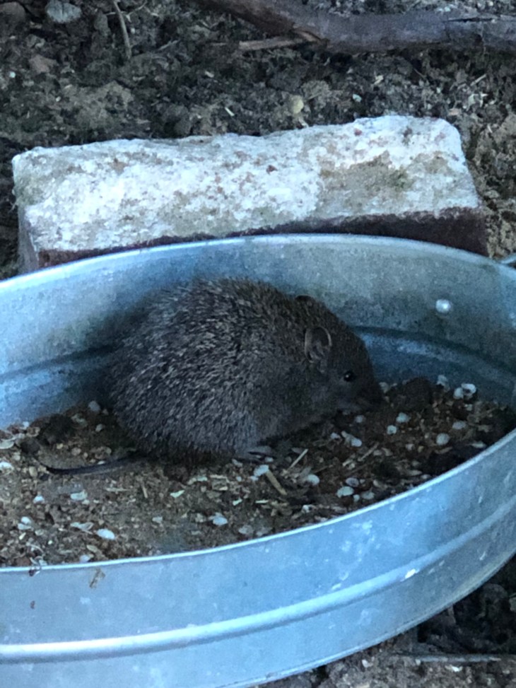 I heard some tiny little munching sounds in the chicken coop. After a slow approach I saw the smallest Quenda in the family of quendas who lives in our garden. She was having his own little breakfast time in the chicken food bowl! She and her dad are often in there eating. I don’t know what has happened to mum Quenda…