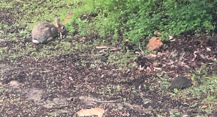 The bunny who lives on our street – mainly in our garden, and the baby quenda is in right corner of photo.