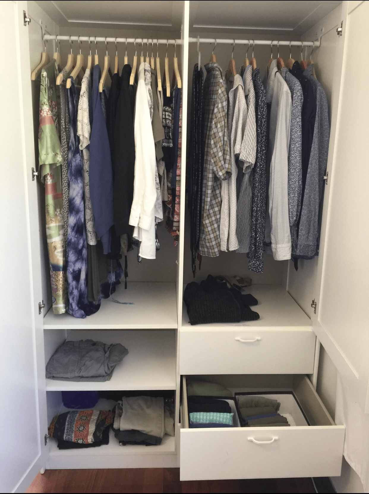 - Put back your keepers neatly and with love. I have 25 hangers and the rest are folded Kondo style into shoe boxes and on couple of shelves.